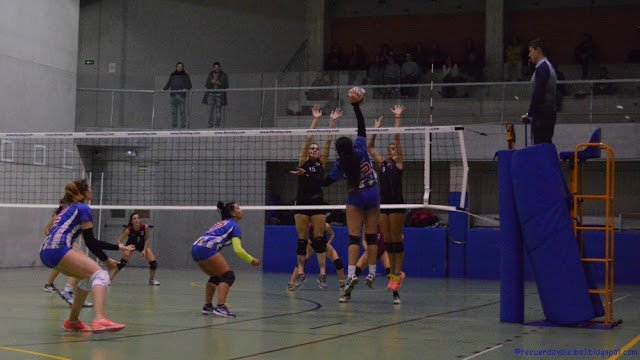 | Ataque de Inés por 2 con doble bloqueo e Irene y Laura al apoyo |